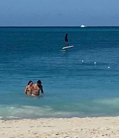 The surfboard-looking device is called a Flyt. It’s basically a short surfboard on a motorized pedastol. If you can keep your balance (and this guy had no problem doing so) you can zip across the water at a pretty impressive clip.