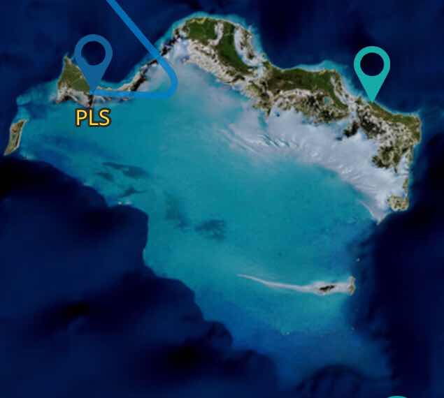 This shows our take-off point — Providenciales’ airport is marked “PLS”. The island containing the airport is called Providenciales Island but actually represents only a small portion of Turks and Caicos. The bulk of the country comprises the larger islands to the right of Providenciales Island, which are only sparsely inhabited, mostly because no bridges connect the islands. The Westjet flight map above shows how the islands are surrounded by a thin reef to the north and a huge shallow area to the south, giving the water that famous turquoise hue. Beyond that, the dark blue shows the deep drop-off to the depths of the Atlantic.